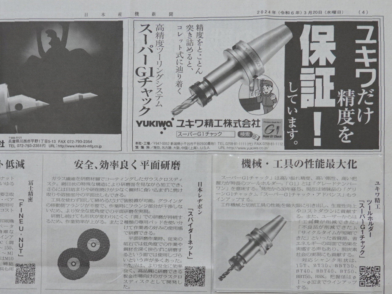 2025年7月24日付け日刊工業新聞 切削工具とツーリング特集に弊社のツーリングシステム・スーパーG1チャックが紹介されました。スーパーG1チャックは、工具の使用量の削減、不良品の削減、サイクルタイム短縮等の効果が期待でき、省資源・省エネルギーにつながる環境にも優しいツールホルダです。実際にお使いいただいたエンドユーザー様からは、「工具費が削減できた」、「不良品が削減できた」という“省資源”、「サイクルタイムが短縮できた」、「機械のダウンサイジングが可能になった」という“省エネルギー”の両面でお喜びいただいております。脱炭素社会を実現するためのツールホルダです。今後とも弊社は、スーパーG1チャックを使用することによる地球環境の保護、ユーザー様における切削加工のコストダウンを提案していきます。