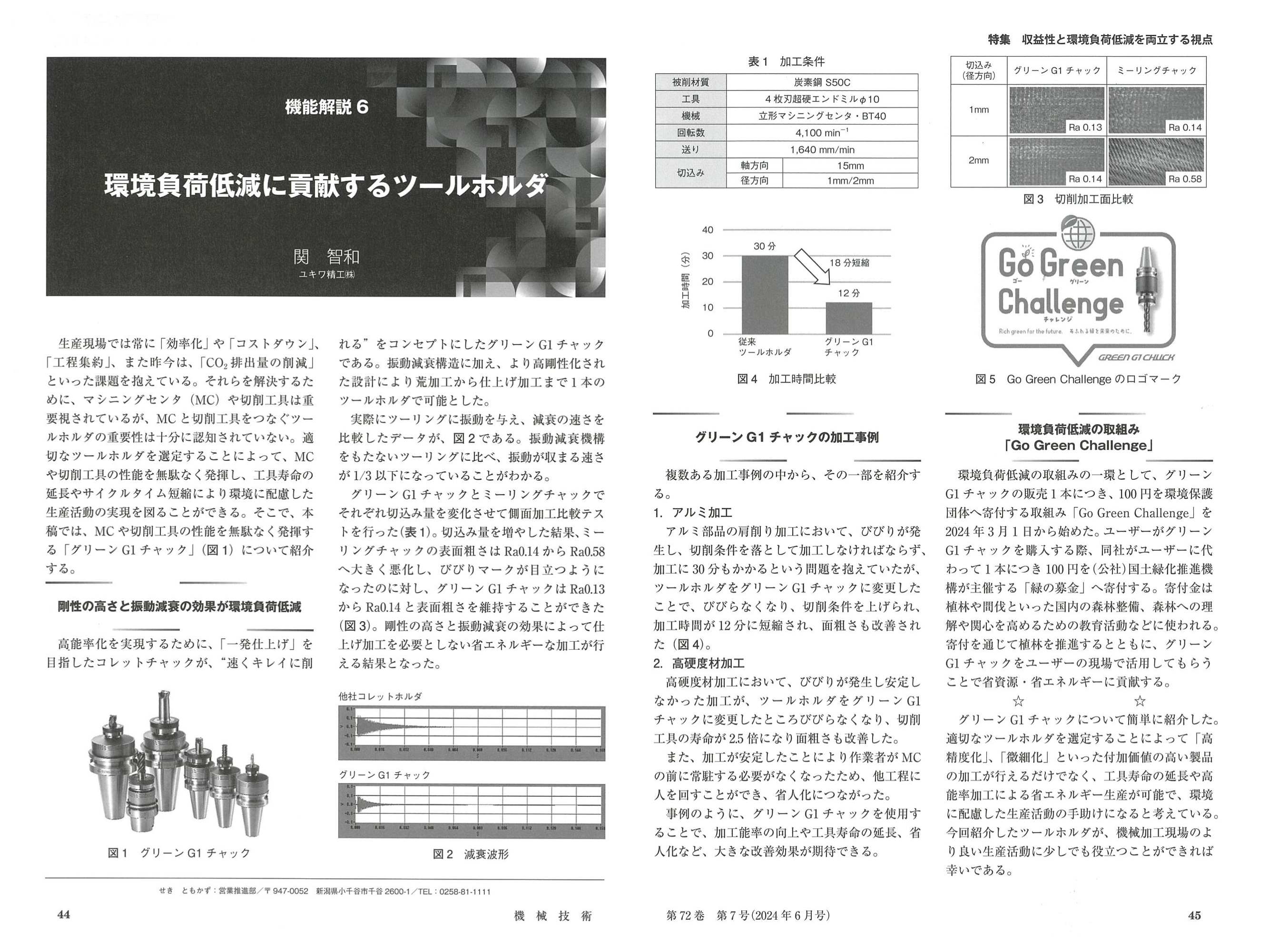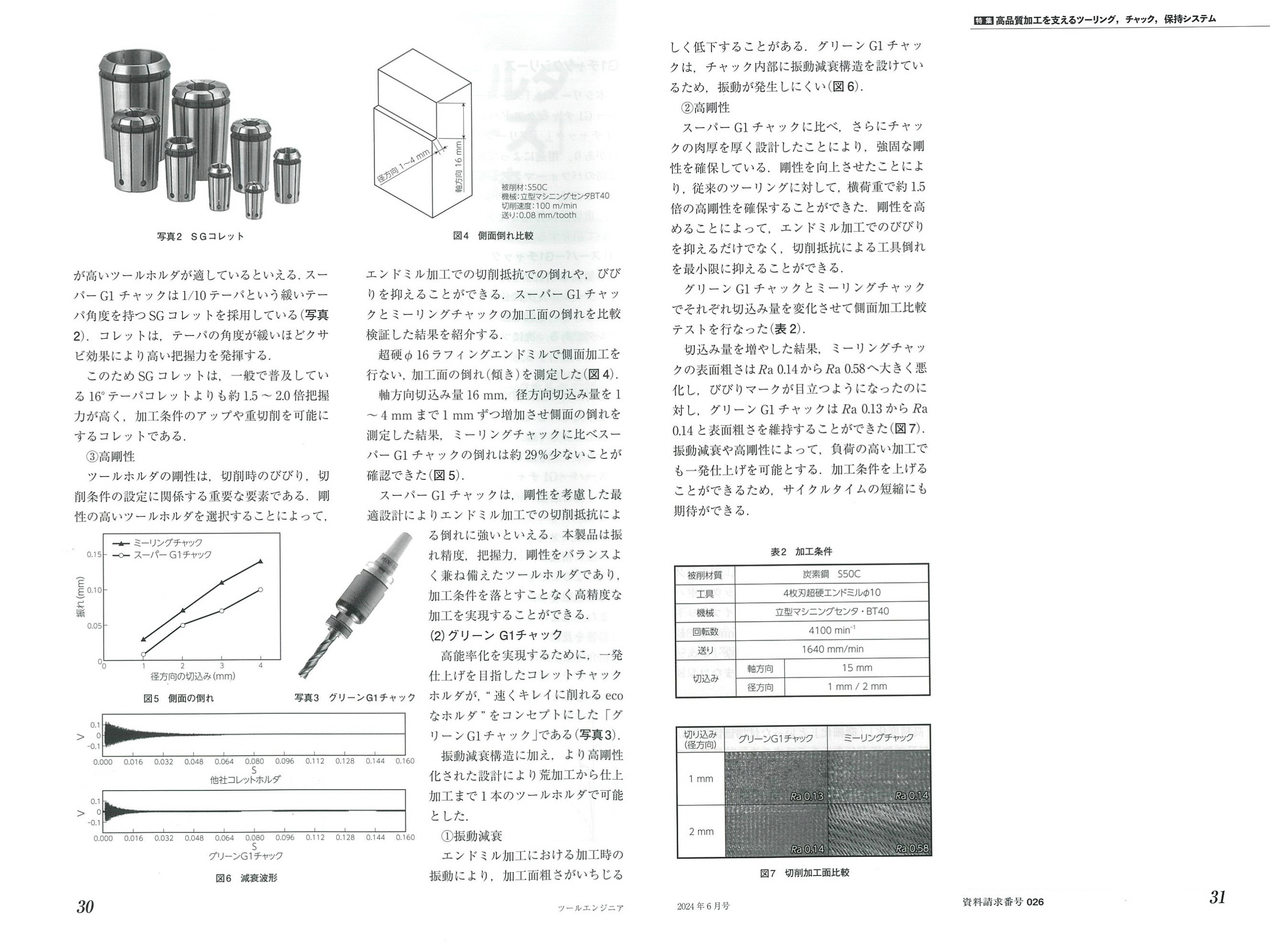 大河出版が発刊するツールエンジニア2023年7月号にG1チャックシリーズが掲載されました。現在、生産現場では高精度化、微細化といった高付加価値な製品が要求されています。また、昨今はSDGsの取り組みとして省エネルギー、省資源が求められています。ツールホルダーは、工作機械と切削工具をつなぐアダプタとして高精度加工を実現するうえで重要な役割を担っており、ツーリングメーカでは、工作機械と切削工具の性能を十分に引き出すことができるよう開発を行っています。本掲載では、工作機械と切削工具の性能を無駄なく発揮するスーパーG1チャック、グリーンG1チャック、ハイブリッドG1チャックについて紹介しております。実際にG1チャックを使用されたユーザー様からは、「切削工具が長持ちするようになった」、「加工ワークの面粗度が上がった」、「加工速度を上げられた」や「加工音が静かになった」など、多くの喜びの声が寄せられています。弊社は、今後もG1チャックシリーズの製造、販売を通して、ユーザー様の省資源、省エネルギーに貢献出来るよう精進する所存です。