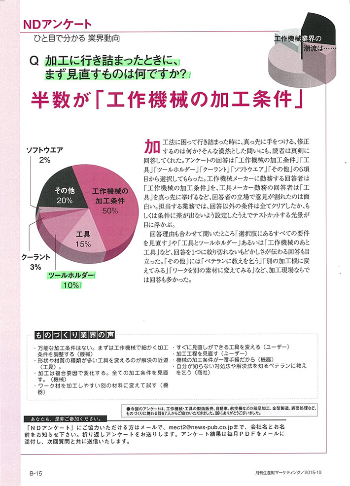 2月1日付け生産財マーケティング誌の『わが社の戦略機種』という項目にて弊社のスーパーG1チャックが紹介されました。切削加工においては、工作機械、切削工具やクーラント方式などが重要視されがちで、ツールホルダーはどれを使っても同じといった感覚で選定されているケースが多くみられます。しかし、ツールホルダーは、工作機械の主軸と切削工具をつなぐ重要な機器であり、実は良いツールホルダーを使うだけで、加工ワークの面粗度、工具の寿命など生産性に大きな違いが出ます。昨年11月に開催されたJIMTOF2014では、小間内にてスーパーG1チャックを紹介する「高能率加工セミナー」を開催し、ツールホルダーの違いによる生産性向上の提案を行いました。JIMTOF2014会期後にスーパーG1チャックを購入いただいたユーザーでは、従来のホルダーと比べ、スーパーG1チャックでの加工面は、“挽き目がキレイ”過ぎるということで、従来の送り速度を2倍に上げ、サイクルタイムを短縮されたという方もいたとのことです。今後とも弊社は、ユーザー様へスーパーG1チャックを使用することによる切削加工のコストダウンを提案していきます。