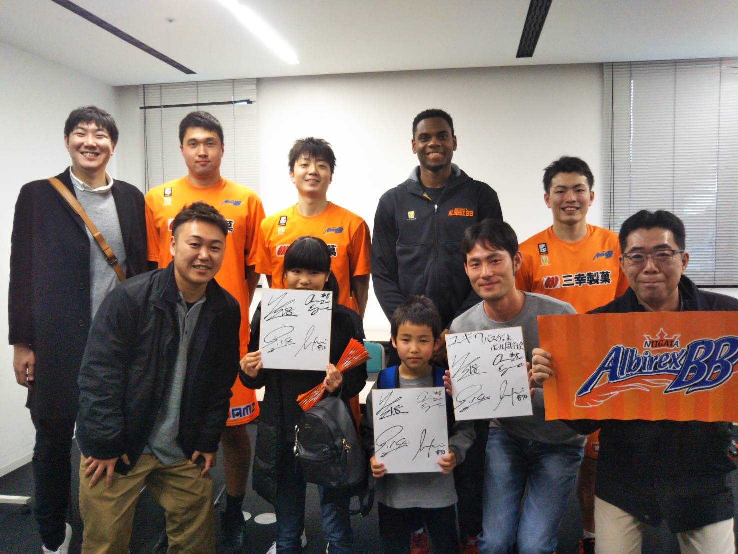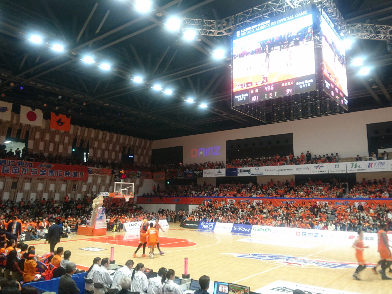 バスケットボールBリーグ新潟アルビレックスBBは、設立当初から県民密着型のバスケットボールクラブとして長岡市を本拠地として新潟県内全域で活動されています。今シーズンは中地区の首位をひた足る活躍ぶりです。当社は前身のbjリーグ時代より1dayマッチスポンサーなどにて新潟アルビレックスBBの活動に協力させていただいています。今回、会社でまとまって応援へ行こう!ということで、社員とその家族の約50名にて、3月3日(日)にアオーレ長岡で開催された名古屋ダイヤモンドドルフィンズ戦を応援に行きました。会場は多くの新潟ブースターの中で行われ、見ごたえのあるシーソーゲームとなりました。そして我々の応援の甲斐があったのか、試合は延長戦にての接戦の末に106対100でアルビレックスBBが勝利を収めました!非常に楽しい時間を過ごさせてもらい新潟アルビレックスBBには感謝しております。また今後も会社としてこのような機会を設けて行ければと考えております。