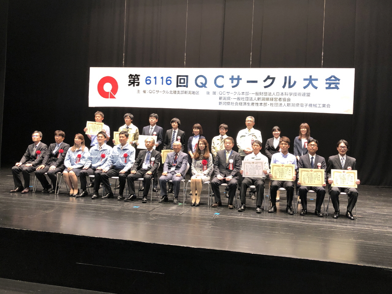 2019年5月15日(水)に長岡リリックホール・シアターホールにてQCサークル北陸支部新潟地区第6116回QCサークル発表大会が開催されました。当社からは、ドリルミルチャック製造グループのメンバーで構成する昨年の全社QC発表大会にて最優秀賞を受賞した「あすなろ」サークルが参加しました。「あすなろ」サークルは、新潟地区大会へは初参加です。審査結果は、惜しくも優秀賞で県知事賞を逃してしまいましたが、会場の聴講参加の皆さまより投票にて選出される“会場特別賞”を見事に受賞致しました。会場から評価されたということは、内容をよく理解していただいたという証明です。また、今回の新潟地区大会への参加で、サークルリーダー、サークルメンバーは貴重な経験をし、大きな成長を感じ取ることができました。当社は、人のレベルアップ、職場のレベルアップ、そして会社のレベルアップを図るために、今後ともQCサークル活動を通じた改善活動、人材育成を進めて行きます。