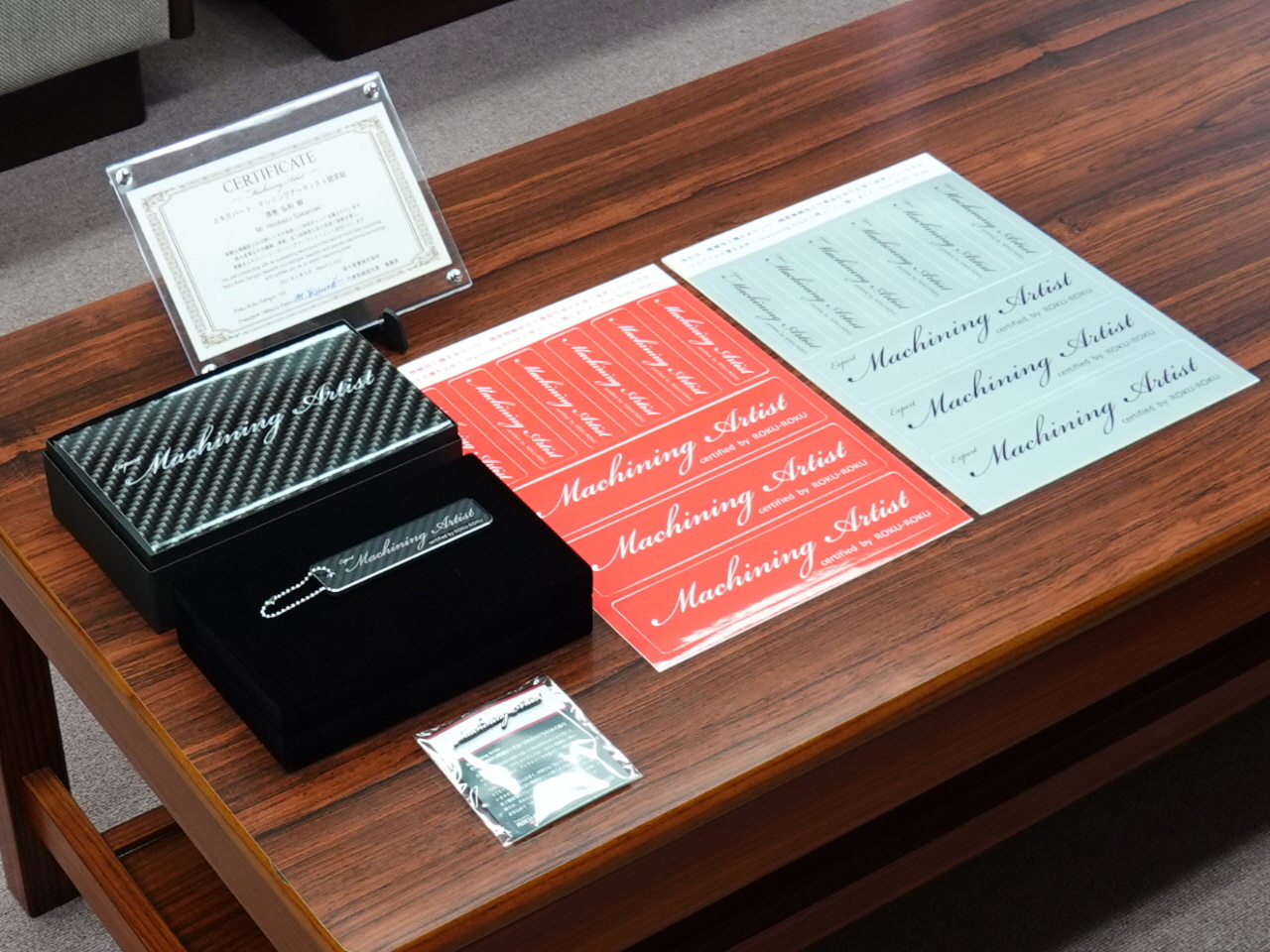 碌々産業株式会社様が認定する『エキスパート・マシニングアーティスト』に認定されました。認定書と碌々産業様の微細加工機にて製作されたキーホルダ―、『Expert Machining Artist』のロゴの書かれたステッカーをいただききました。そして、海藤社長より認証制度の背景、微細加工への想いについてお話を伺うことが出来ました。当社と致しましては、「良い加工をするためには、良いツールホルダーが必要である」ことを全国のみならず世界中へ伝播することをミッションとして、今後とも微細加工業界の発展、そして人財の育成に貢献して行きたいと考えております。