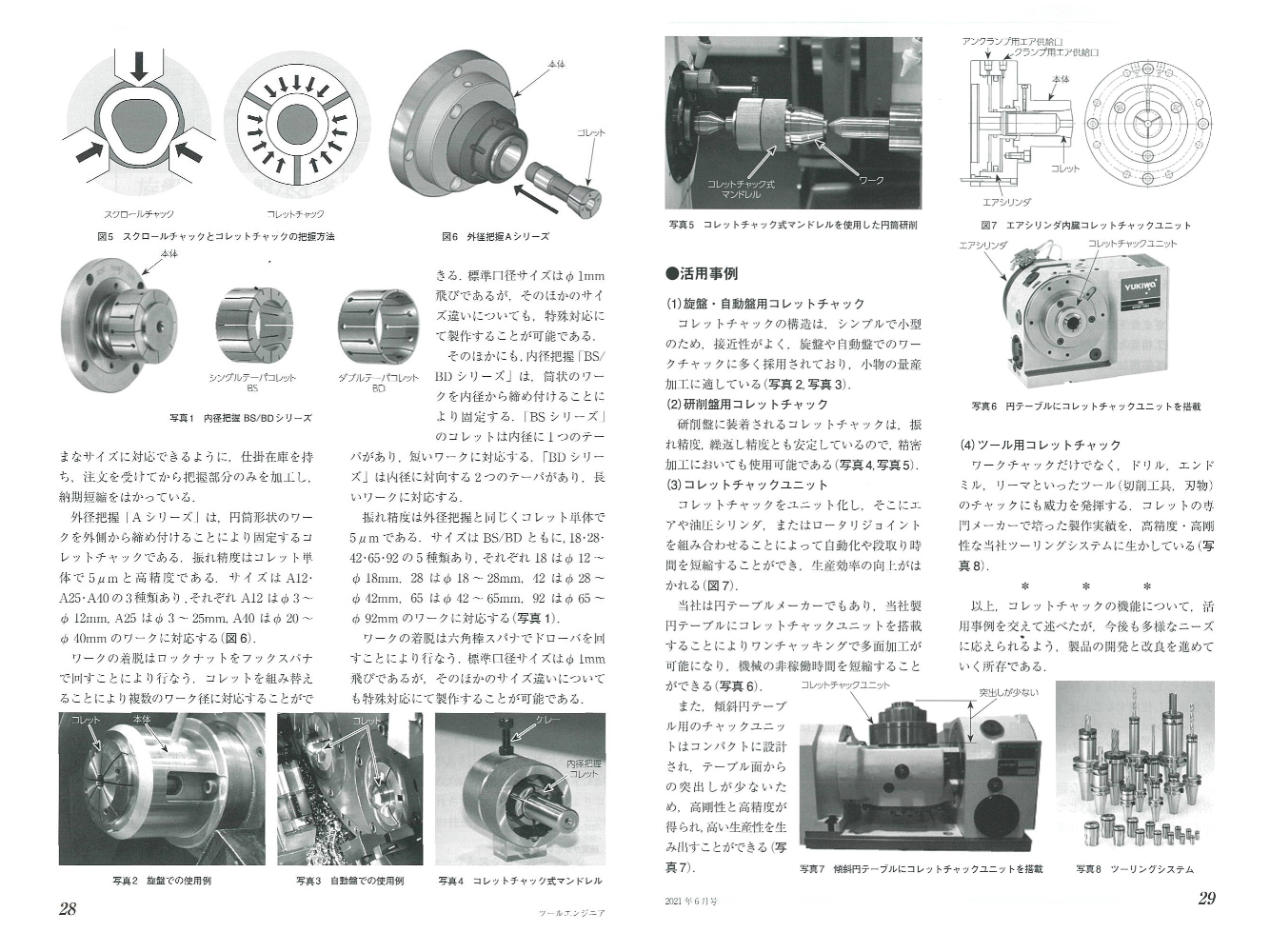 大河出版が発刊するツールエンジニア2021年6月号「素材を確実に保持するジグ&取付具・固定具特集」に『コレットチャックの機能と活用例』として弊社のコレットチャックが紹介されました。コレットチャックはスプリングコレットとも呼ばれ、工作機械や搬送機の部品の一部で、その機械に組み込まれて使用されます。サイズ、把握方法や把握力など対象ワークにより多種多様で、幅広い用途でワークまたは切削工具の固定に使用されています。現在弊社では、お客様のご要望に応える形で、コレットチャック製品の標準化を図るとともに、今までの製作実績を事例として紹介する専用カタログを作成するなど、ニーズに合ったコレットチャックをお客様へ提供出来るよう製品を拡充しております。近年では、CNC円テーブルと組み合わせてワークの着脱に使用されるユーザー様も増えております。弊社は、今後もコレットチャックの製造、販売を通して、ユーザー様の品質向上、生産性向上に貢献出来るよう精進する所存です。
