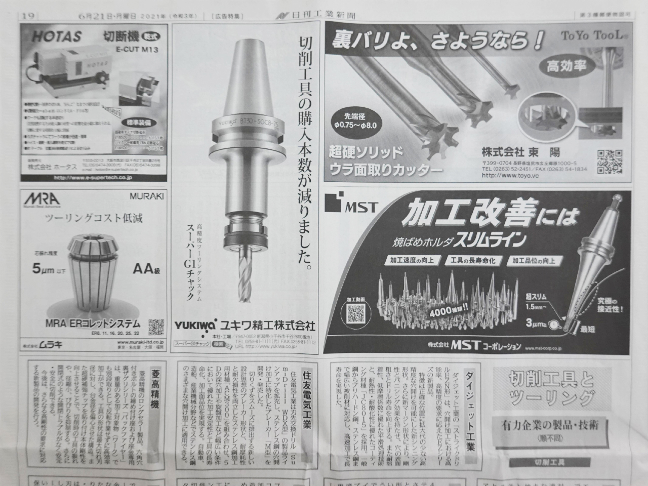 2021年6月21日付け日刊工業新聞 切削工具とツーリング特集に弊社のツーリングシステム・スーパーG1チャックが紹介されました。ツールホルダーは、工作機械の主軸と切削工具をつなぐ重要な機器であり、良いツールホルダーを使うだけで、生産性に大きな違いが出るということはあまり知られていません。また、見た目に大差はないツールホルダーは、価格等が重視され、購入時にはあまり気を使われていないユーザー様が多いことが現状です。実際に当社のスーパーG1チャックを使われたユーザーからは、「切削工具が長持ちするようになった。」、「加工ワークの面粗度が上がった」、「加工速度を上げられた」や「加工音が静かになった」など、多くの喜びの声が寄せられています。今後とも弊社は、スーパーG1チャックを使用することによる切削加工のコストダウンを提案していきます。